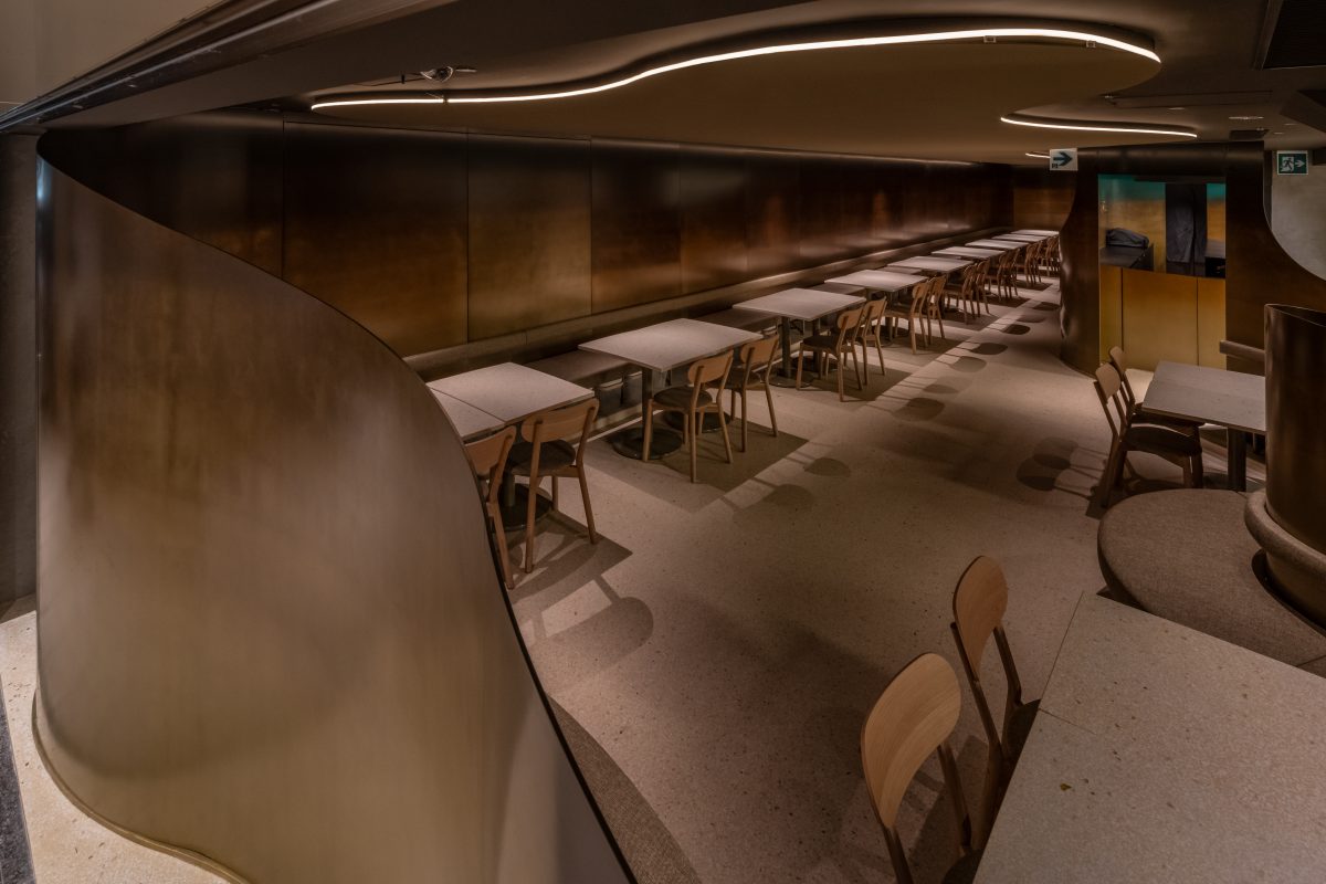 設計を担当されたのは、吉村靖孝建築設計事務所とナノメートルアーキテクチャー。 おふたりが目指されたのは、伝統を尊重しながらも、現代の都市空間に調和する「和」のあり方です。 人の流れが多く、空調や湿度変化の大きい地下街という環境では、素材には美しさと同時に、耐久性やメンテナンス性も求められます。 そのような条件の中、私たちにお声がけいただき、「MetalSurface(メタルサーフェス)」という表面処理技術を活かした金属素材をご提案しました。