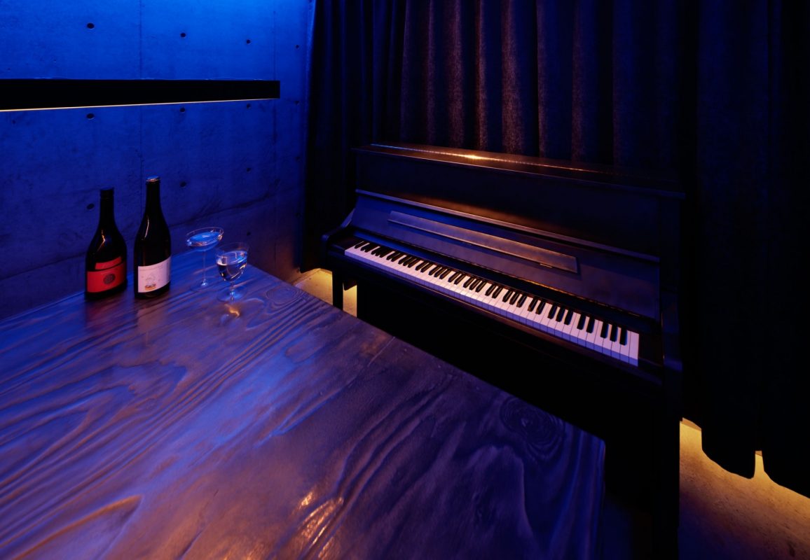 浮造りは、木目の硬い部分を残し柔らかなところを削ることで、木目を際立たせる伝統的な製材処理のひとつです。この際立った木目を生かしながらのバーカウンターを作成するのが今回のミッションでした。錫を吹き付けたのち、手磨き仕上げを行い、美しい銀肌を実現しています。 課題となったのは、一枚板的な印象の創出です。運搬や木材の都合上、すべてを一枚板で構成することが不可能であったため、分割した木材にしながらも近しい木目で組み上げていく必要がありました。天板から立ち上がり面まですべてを浮造りにしていることからも、木目の組み合わせの難易度が極めて難しく、かつ重要なポイントでした。