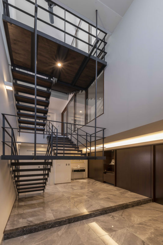 空間が縦に増えていくときに、各部屋=空間を繋いでいく役割を果たすのは階段です。同時に、階段と同素材を部屋のフレームに用いることで、空間全体に統一感が出てきます。当案件は、それをメタルでつないでいくと言う設計意図があり、弊社に依頼がありました。 一階から三階までが吹き抜けとなっており、そこにスチールの階段がかけられています。このスチール素材を、2階の内向きの窓枠にすることで、一体感のある巨大な空間コンセプトが見えてきています。これだけの階段をスチールで作るとなると、当然重量もすごいものとなります。この建物全体が非常に高い強度の構造であることがこの部分だけからも見て取れます。